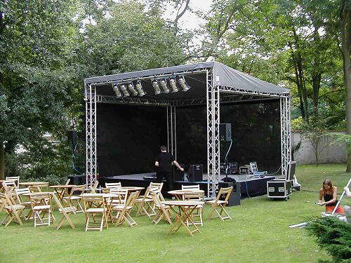 Bühne 6 x 5m Bühnendach, 6 x 4m Spielfläche mit Mali-Tanzbodenbelag grau.Inclusive Beschallung und Beleuchtungsanlage, im Anschluß der Außenveranstaltung, Discoanlage im Brücke Saal. 1/1