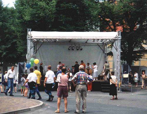 Open-Air-Bühne 7m x 5m x 5m, 0,8m Podesthöhe, Stellung von Beschallungs- und Beleuchtungsanlage sowie die Bedienung durch Licht- und Tontechniker. 8/9