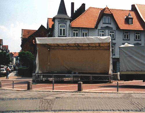 Open-Air-Bühne 8m x 6m x 5m, 1m Podesthöhe, Stellung von Beschallungs- und Beleuchtungsanlage sowie die Bedienung durch Licht- und Tontechniker (Bühne noch ohne Technik abgebildet). 9/9