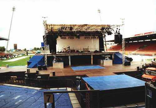 Bühnenbau einer unserer Kooperations-Unternehmen, im Auftrag für Firma Light`n Sound. Slik-Groundsupport: Bühnendach 16,40 x 12,56 Meter, Towerhöhe 11,40 Meter, insgesamt 334 Stück Podestplatten = ca.670 qm Bühnenfläche, bespielbare Zwischenebene. Gewicht PA: je Seite 1,5 Tonnen Gewicht Licht: 2,5 Tonnen Projektionsfläche: 10 x 6 Meter. 1/1